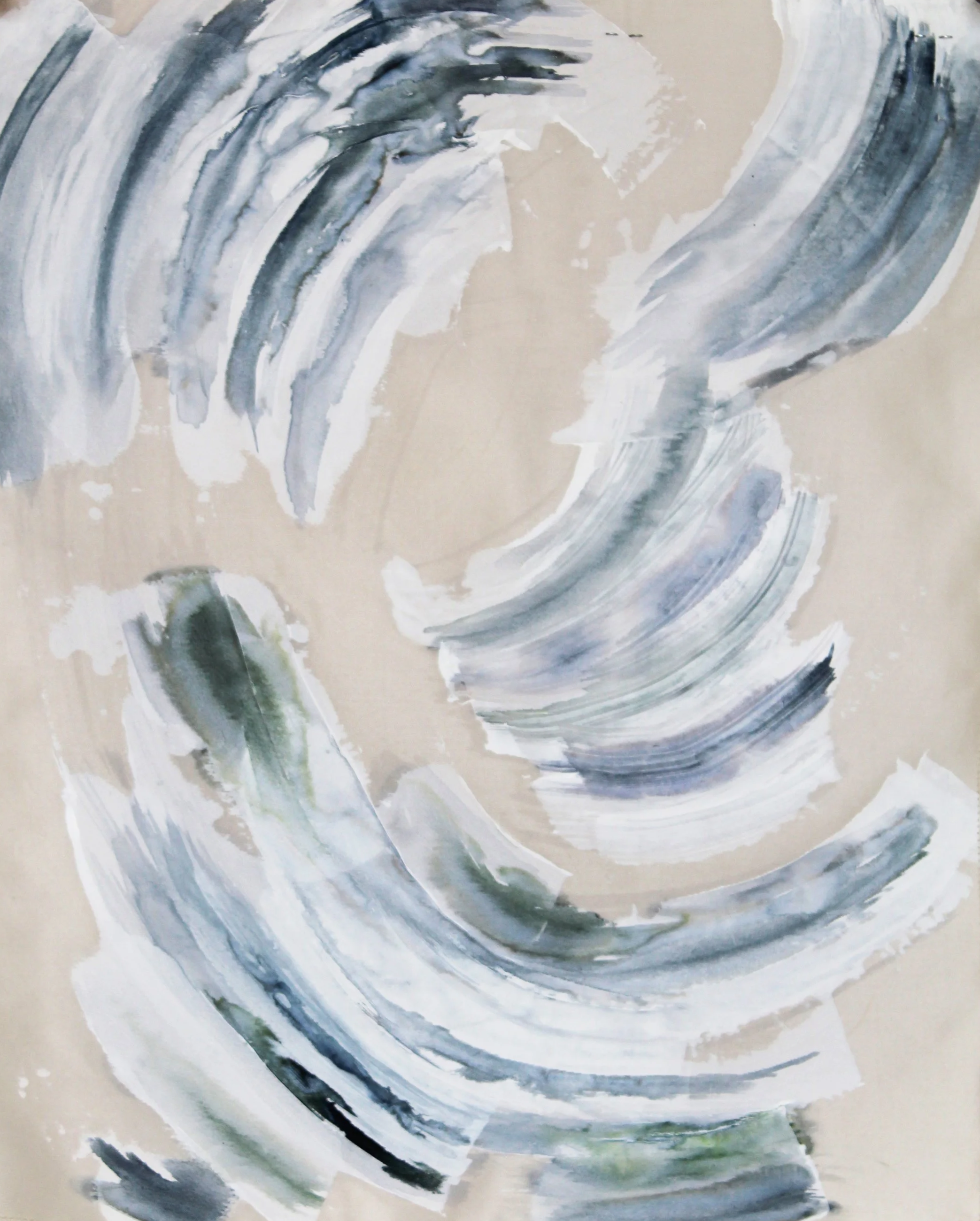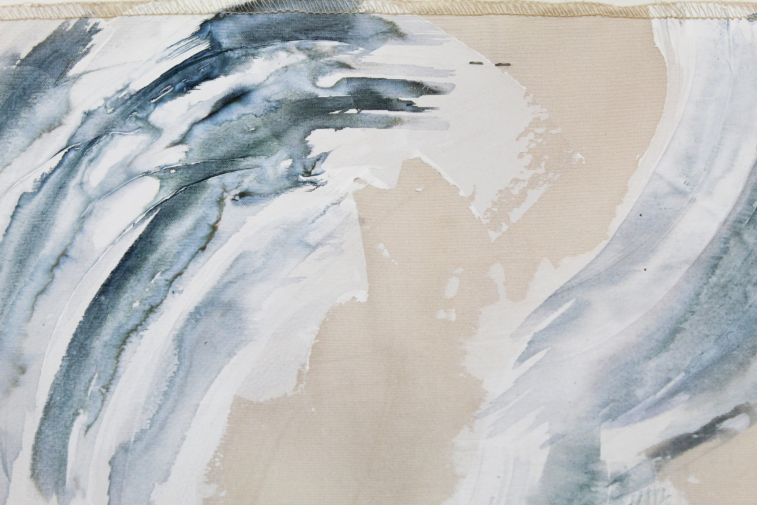 Rhythmic hand-painted strokes layered with ink on silk Taffeta create a calm, fluid movement across the surface.