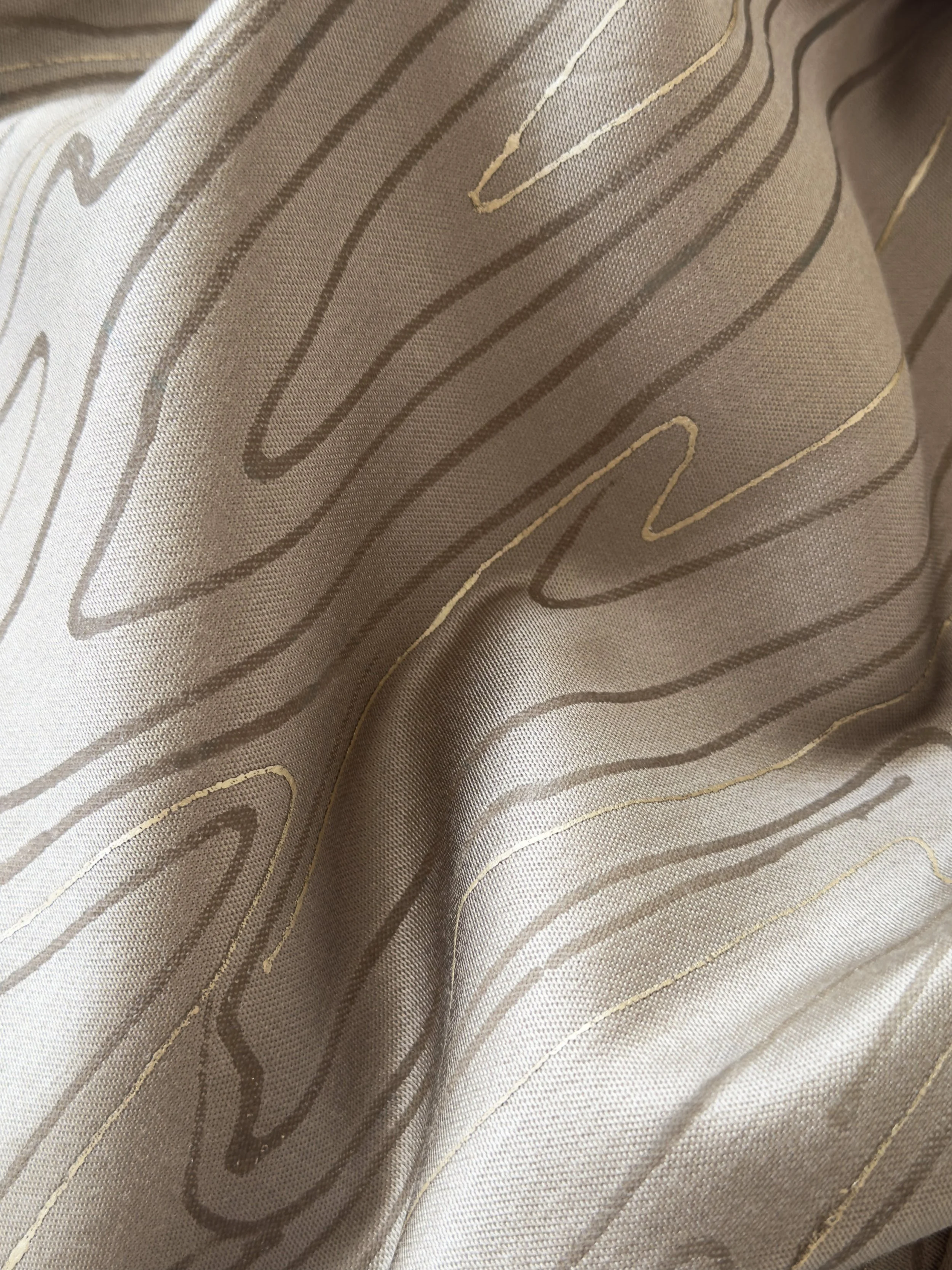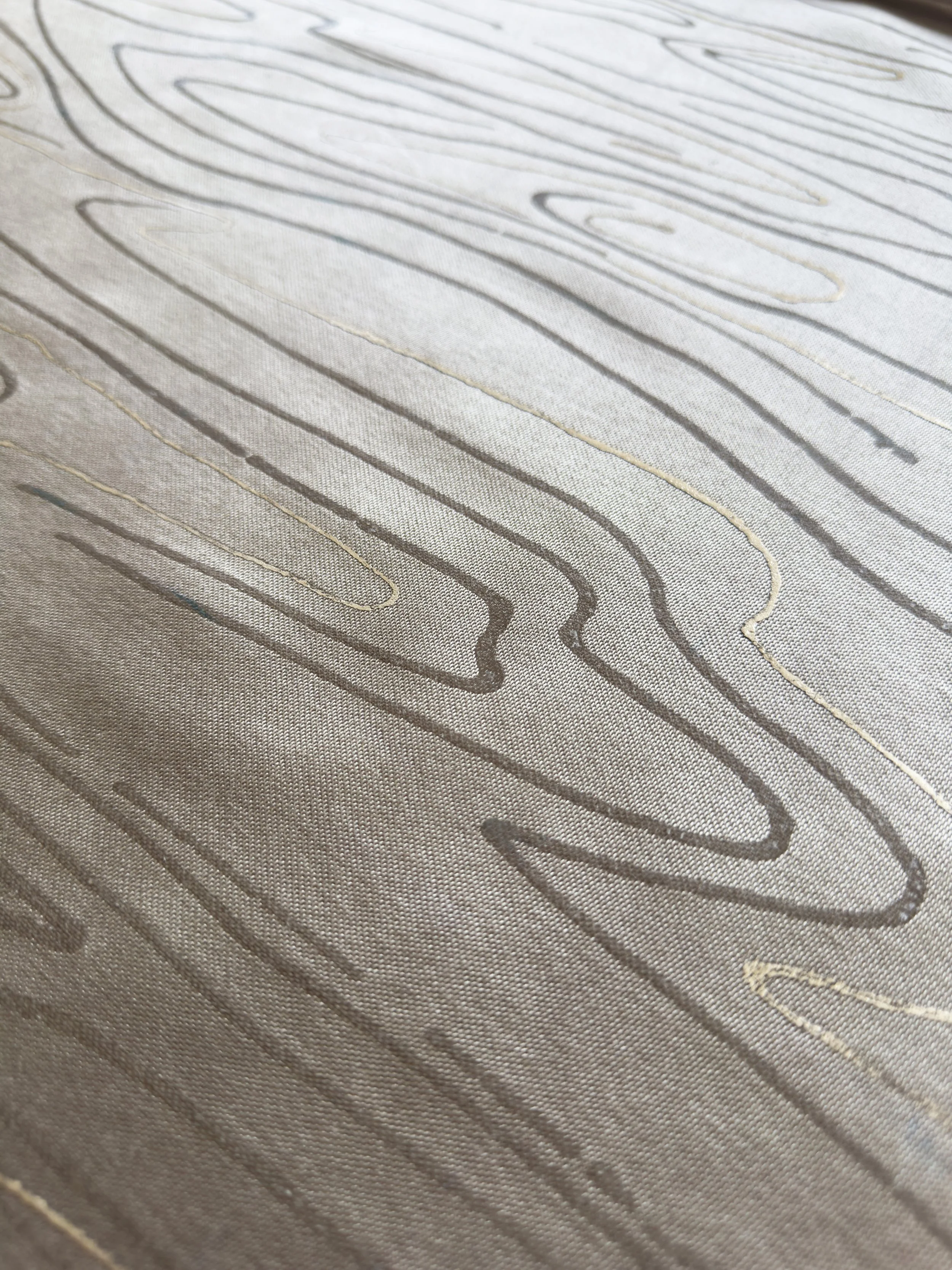 Rhythmic hand-painted strokes layered with ink on silk Taffeta create a calm, fluid movement across the surface.